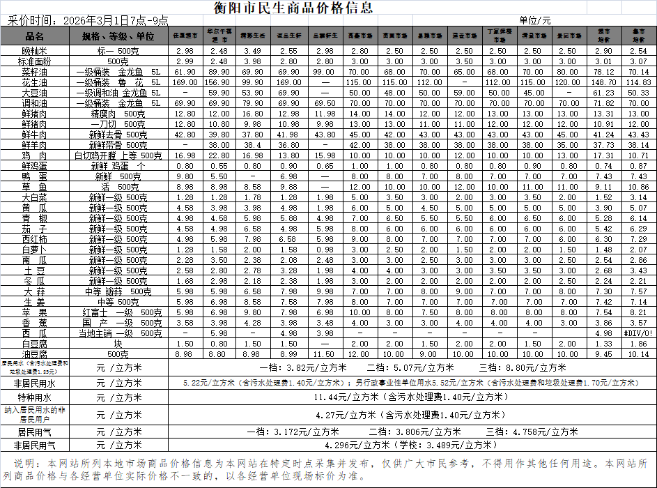 【物价】 2026-3-1衡阳市民生价格信息