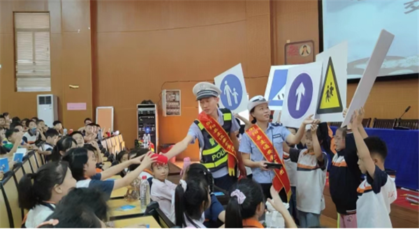 民警从实验学校门口常见的不文明、违法交通行为入手,针对小学生的心理特点和年龄特点,用生动活泼的语言、如沐春风的亲和力,向大家讲解各类交通违法行为的严重危害,并结合“知危险,会避险”主题,传授步行、骑车、乘车需要注意的安全事项,引导学生们文明出行,争做遵规守法小标兵。民警还结合“一盔一带”、“戴帽工程”、常见交通标志、“一老一少”群体交通安全知识等,与学生们开展互动问答,并发放了小礼物。现场一片欢腾,学生们踊跃参与,气氛热烈。
