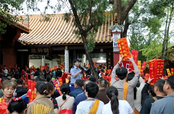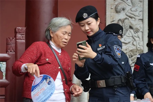 女子巡逻队持续开展柔性引导、便民服务和文明提醒,同时在大庙主殿前设置公安服务点,将“反电诈”和“交通安全宣传”融入工作中。