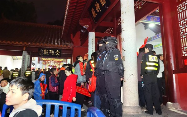 为切实做好大年初一群众自发旅游祈福活动安保工作,市、区两级党委、政府和公安机关高度重视,提前谋划,精心部署,按照“城外控车、庙外控人、庙内控流”的原则,引导游客有序流动祈福。
