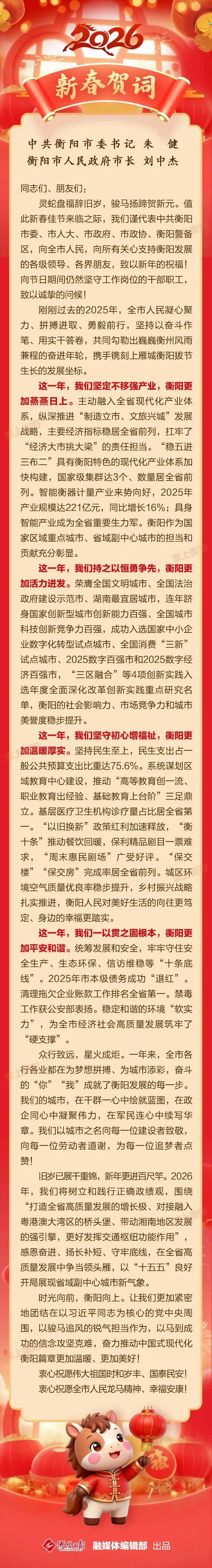 衡阳市委书记朱健、市长刘中杰发表2026年新春贺词
