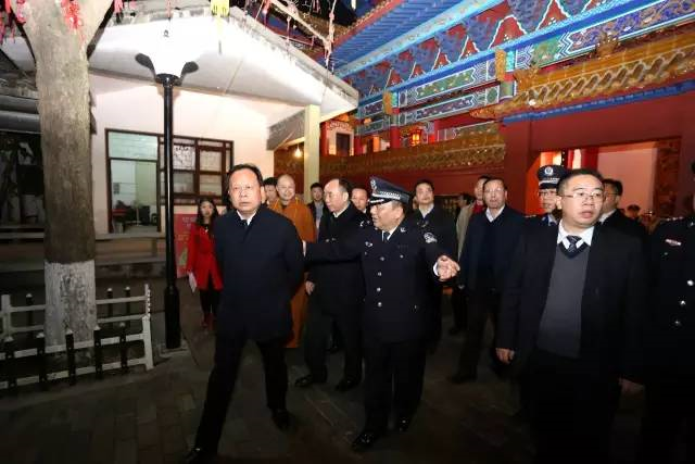 随后,周农一行抵达城区,视察雁峰寺的安保工作。在市公安局,周农看望慰问坚守岗位的市公安局领导和民警,并通过视频系统调度了全市七县五区的春节安保工作情况。