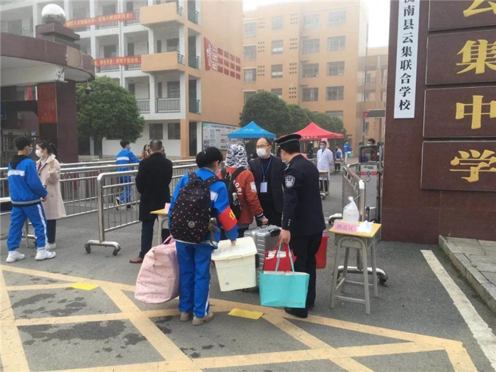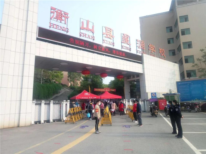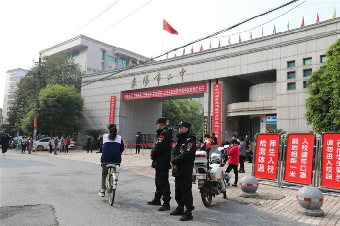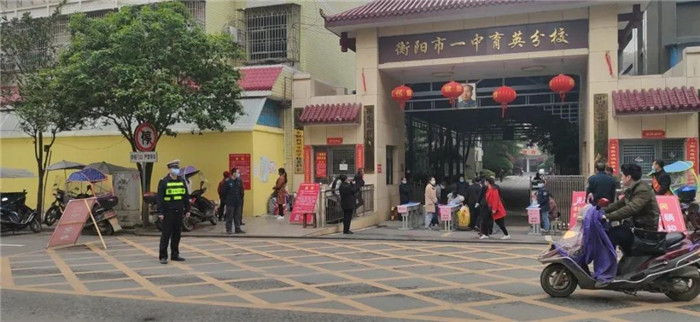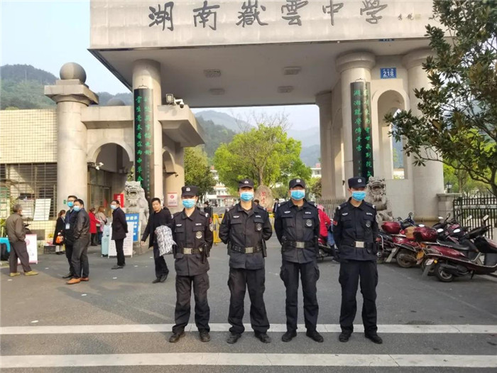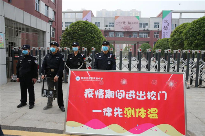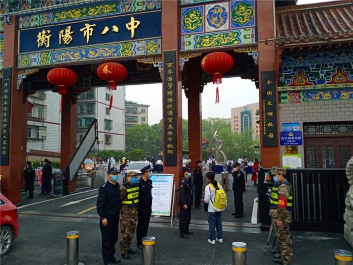 △南岳区第一中学、岳云中学、文定中学、实验中学的高三年级和初三年级开学,南岳公安“校园卫士”护卫队在每个学校入口处安排警力执勤,维护学校周边的交通和治安环境稳定,配合街道工作人员对进校人员进行防疫消毒和体温检测,为平安开学贡献力量。