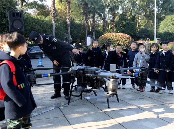 活动现场,讲解民警带领小朋友和教师们游览了无人机、机器狗、枪械等警用装备并介绍了用途和使用方法,令萌娃大开眼界,踊跃体验。特警队员的战术演练如同一场震撼人心的视觉盛宴,将现场气氛瞬间推向高潮。当演练指令下达,队员们如离弦之箭般迅速展开行动,他们的配合默契无间,仿佛是一个紧密相连的整体,尽显英勇。孩子们不时发出一阵阵惊叹声。