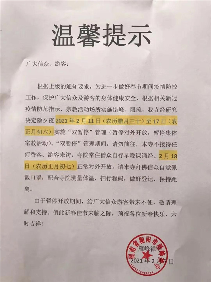 为进一步做好春节期间疫情防控工作,保护广大信众及游客的身体健康安全,根据相关新冠肺炎疫情防范要求,雁峰禅寺将于除夕夜2021年2月11日(农历腊月三十)至17日(农历正月初六)实施“双暂停”管理(暂停对外开放,暂停集体宗教活动),寺庙不接待任何香客、游客来访。2月18日(农历正月初七)正常对外开放。请届时前往寺庙的信众、游客自觉佩戴口罩,配合寺院测量体温,扫行程码,做好登记,保持距离。