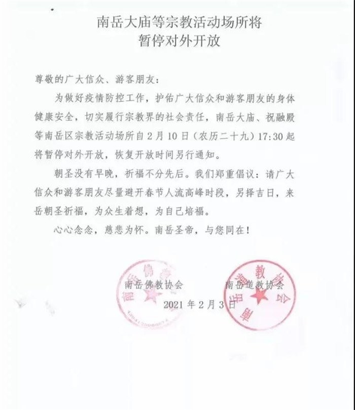 南岳大庙、祝融殿等室内型景区景点及全区所有宗教活动场所2月10日17:30起暂停对外开放。