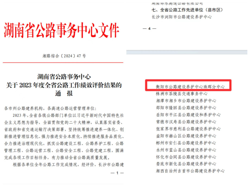 近日,湖南省公路事务中心印发《关于2023 年度全省公路工作绩效评价结果的通报》,珠晖公路分中心荣获“全省公路工作先进单位”称号。