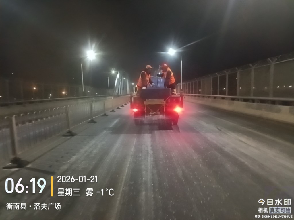 闻警即动,迅速部署。20日16时28分,衡阳市气象台发布道路结冰黄色预警信号。全市公路系统立即启动区域联动机制,加大巡查频次,并对易结冰路段开展预防性除冰作业。17时起,全市各级公路部门迅速响应,对重点路段继续不间断强化巡查和专人值守,实时掌握路面状况,确保隐患及时处置。