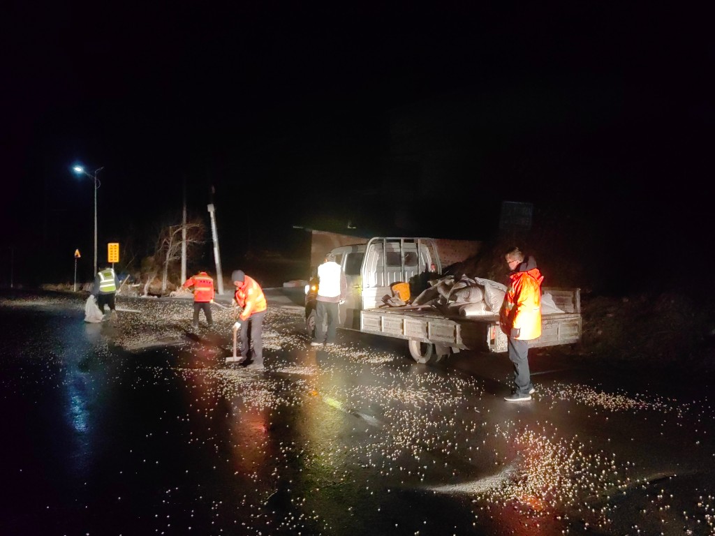 昼夜奋战,不畏严寒。夜间至凌晨是气温最低、路面最易结冰的关键时段。各地公路养护人员身着防寒服、手戴防护手套、佩戴反光背心,干部职工共同奋战在夜色中,持续开展巡路、除冰、融雪作业,以通宵坚守筑牢道路安全防线。截至目前,全市累计出动抗冰人员757人次,投放融雪剂98.9吨,投入除冰设备25台班。