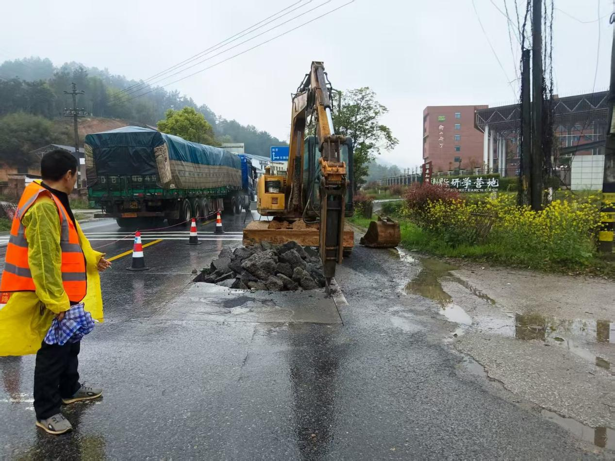 作业现场,养护队伍分工明确、协同高效。安全人员迅速布设警示标识,规范设置作业区,做好交通疏导与现场安全防护。随后,抢修人员按照养护标准,对坑槽进行切割规整、清理浮渣、打孔植筋、浇筑混凝土、摊铺刮平等工序,确保修补面与原路面衔接紧密、平整牢固。整个过程衔接紧凑、推进迅速,仅用一天时间完成3处坑槽修补,整治破损路面约80平方米,有效改善了辖区公路路况质量。