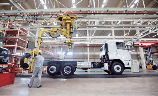 7月14日,白沙洲工业园湖南华菱汽车有限公司生产车间,工人正在为一辆即将生产下线的重型卡车装备轮胎。