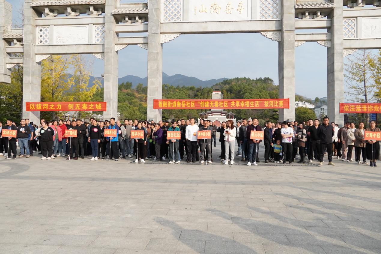 11月24日,祝融街道衡岳社区组织7个小区居民在万寿广场举办了一场别开生面的"创建无毒社区 共享幸福生活"拔河比赛,将禁毒主题巧妙地融入到拔河比赛中,让禁毒宣传不再枯燥乏味。本次拔河比赛共有16支队伍参加,其中包括8支男队、8支女队,每队由12人组成,共计192人参加了此次比赛。