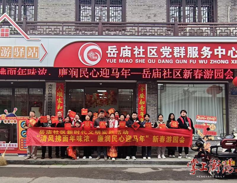 掌上衡阳2月26日讯(通讯员江漫 周琪全媒体记者莫雄飞)2月25日上午,南岳区祝融街道岳庙社区举办"清风拂面年味浓,廉润民心迎马年"清廉主题新春游园会,以年味为纽带,吸引辖区党员、居民踊跃参与,在欢声笑语中品年俗、学廉洁、聚合力。