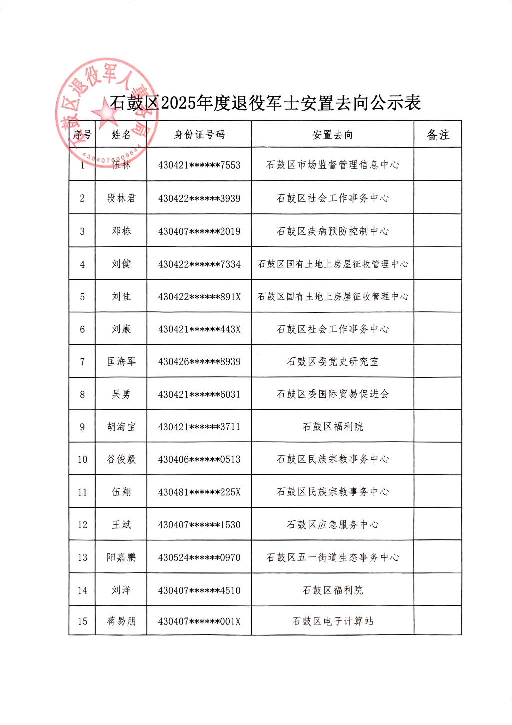 【区退役军人事务局】石鼓区2025年度退役军士安置去向公示表