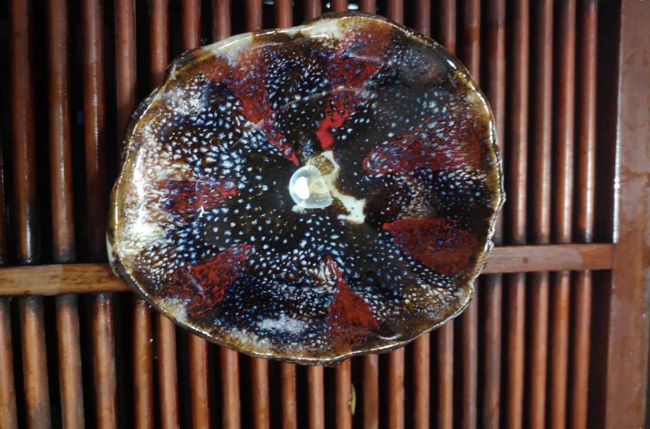 该文创产品创新地融合湘莲莲蓬的造型,清新自然。为适应当代审美需求,装饰上利用不用色釉在内壁作多层次的施加洒、涂、浇、点、滴等多种手法,入窑后因相互渗透、流淌而形成不同的窑变花纹。不仅源于中国国画的大写意手法,配色上也提取了西方印象派的色彩元素。