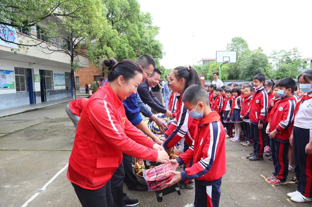 参加公益活动的领导们为孩子们送上学习和体育用品