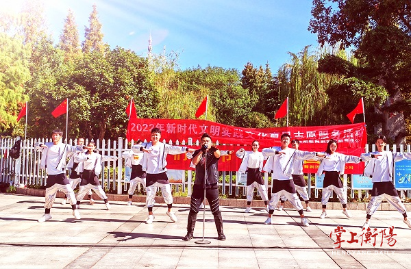 10月1日,国庆长假第一天,市歌舞剧团有限责任公司的演员们在回雁峰牌坊前、雁峰区黄茶岭街道幸福社区内,分别开展演艺惠民演出。豪迈雄壮的歌舞《大中国》《放飞梦想》烘托出喜气洋洋的节日气氛,衡阳非遗经典之作丝弦《四季花儿开》、音乐快板《我为衡阳来点赞》透着浓浓的"地方味",还有妙趣无穷的川剧表演《变脸》为观众带来了快乐。