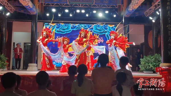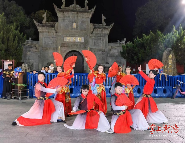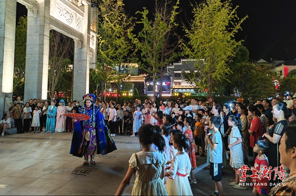 在南岳古镇,该公司分别在10月1日、6日举办了两场游街表演活动和非遗展演。演员们沿着万寿广场、庙东街、大庙前坪、四牌楼牌坊载歌载舞,接连上演变脸、喷火、快闪,引得游人一阵阵欢呼。在古戏台,折子戏《打神告庙》《说媒》等节目散发出衡阳地方戏剧的独特魅力,勾起了观众浓厚的兴趣,给外地游客留下了深刻的印象。