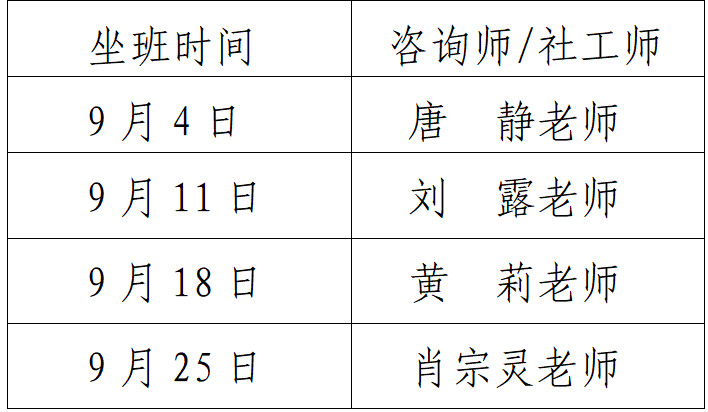 衡阳市退役军人接待服务大厅心理服务室,为广大退役军人提供专属心理调适服务。每周星期四上午9:00—12:00安排专业心理咨询师现场坐班,提供免费的心理咨询、心理疏导、人文关怀、精神抚慰等服务。现将9月份心理调适服务现场坐班安排情况公布如下: