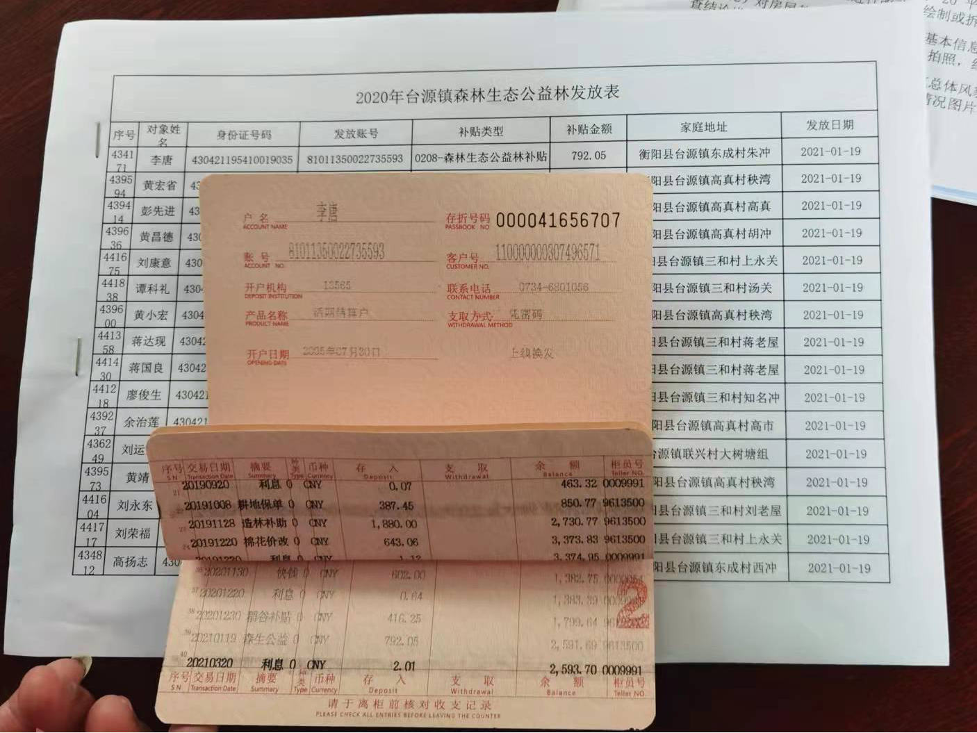 “现在国家政策好,每一笔补助都会打到这个专用存折,这是今年上半年发放的森林生态公益林补助资金792.05元,”在衡阳县台源镇东成村,村民李唐高兴地向市林业局“一卡通”专项整治检查组介绍自己的“一卡通”存折情况。