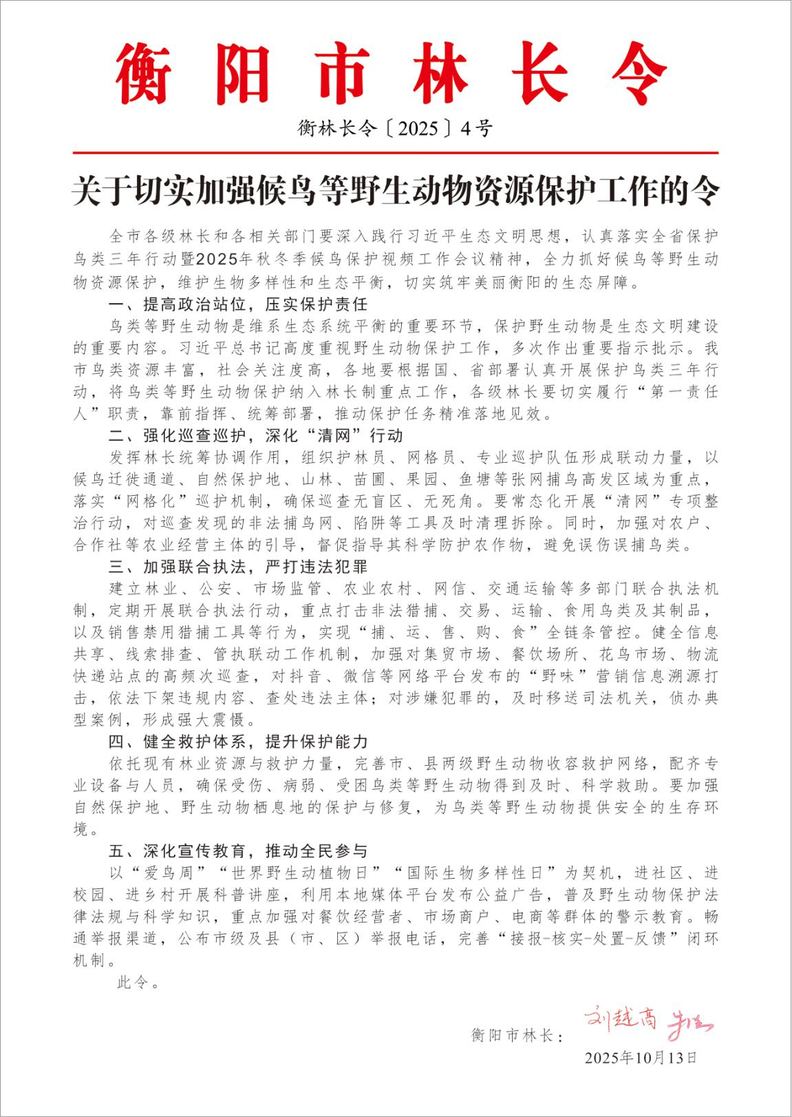 近日,市委书记、市林长刘越高,市委副书记、市长、市林长朱健共同签发衡阳市2025年第4号林长令,对候鸟等野生动物资源保护工作进行部署。