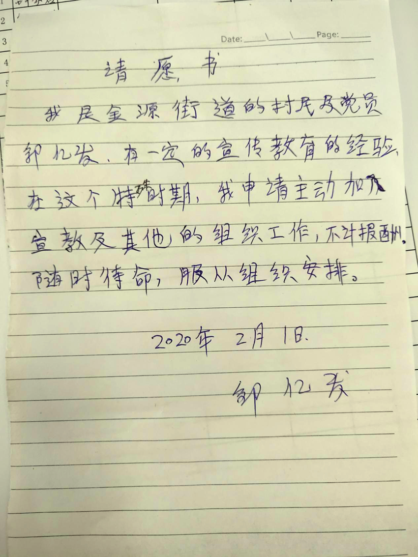邹酒铺组党员邹亿发主动提交一线抗疫“请愿书”,随时准备参与一线工作