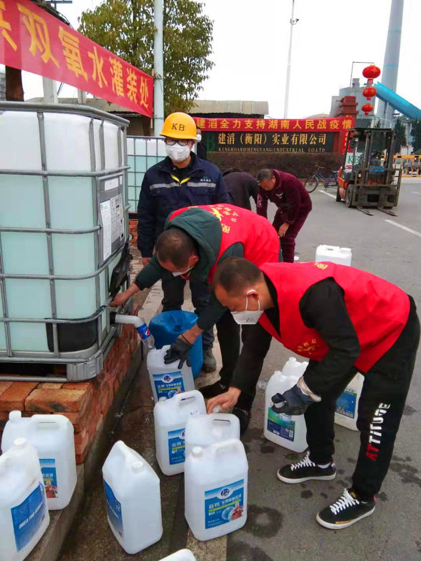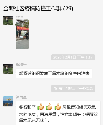 邹酒铺组组长张红军、会计祝和平自购容器盛装双氧水,免费发放给组内居民消毒杀菌