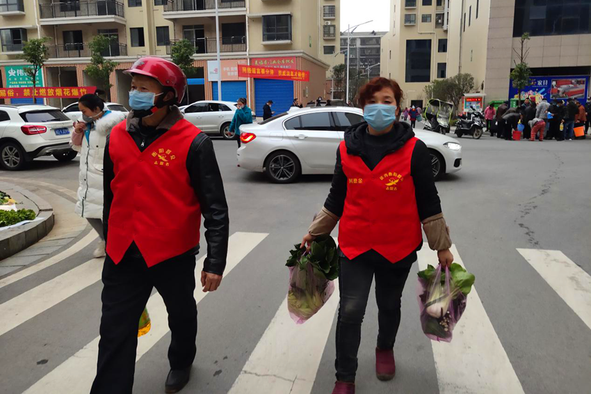 已离休的原社区妇女主任、“衡阳群众”志愿者何德金和志愿者祝全省主动捐献自己种植的蔬菜给居家隔离对象