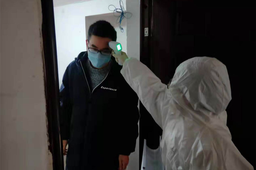 支部委员彭文友、屈祖雁陪同医护人员上门检测体温