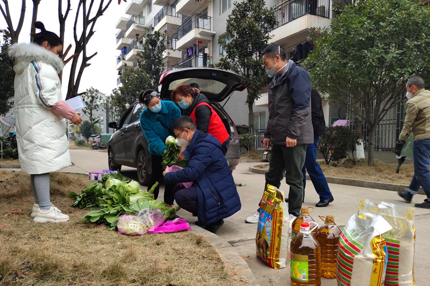 金源街道办事处副主任、武装部部长蒋必伟和社区两委干部给居家隔离对象发放生活物资和防疫物资