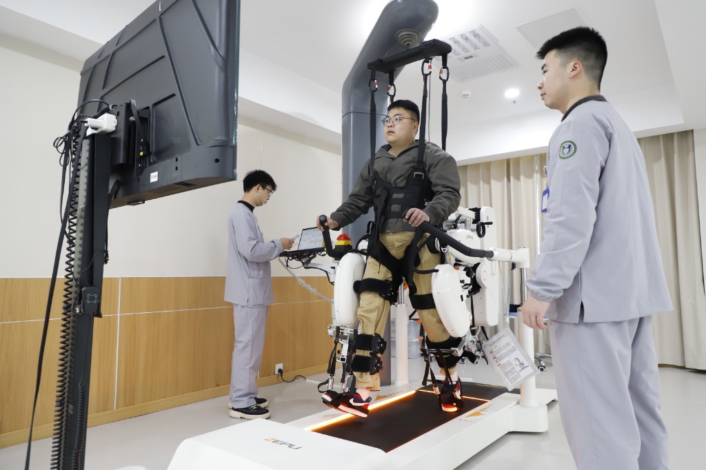 △衡阳市首台AI康复机器人,通过AI调控,可帮助患者重建人体的行走功能。