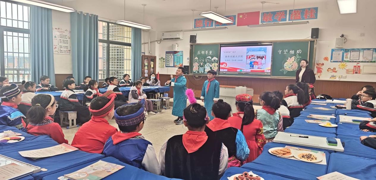 都司街碧桂园小学、五一路小学作为省级铸牢中华民族共同体意识示范学校,共享创建经验,推动校际协同共进,形成“铸牢”教育各美其美,美美与共。11堂思政课打破学科壁垒,分别从不同角度、不同视野,讲述铸牢中华民族共同体意识教育实践事例,将“铸牢”种子播撒在青少年心灵深处。都司街碧桂园小学语文学科《大青树下的小学》,五一路小学道德与法治学科《互相尊重,守望相助》,人民路小学数学学科《认识负数》等各具特色,引得听众连连叫好。《认识负数》引入《长津湖》影片冰雕连事例,让学生在计算零下30℃温差过程中,感悟伟大抗美援朝精神,体会家国情怀的真谛。