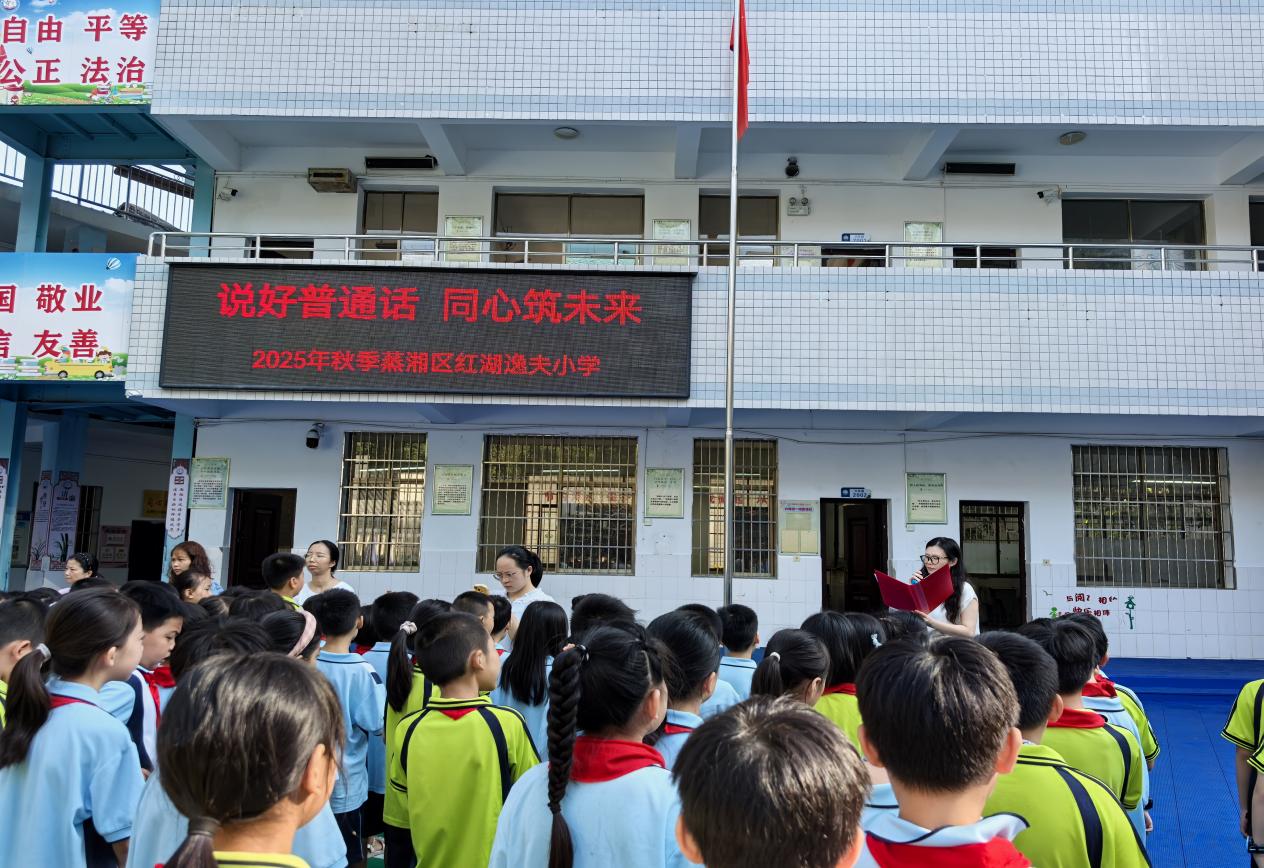 蒸湘区红湖逸夫小学以"说好普通话 同心筑未来"为主题,隆重举行第28届全国推广普通话宣传周系列活动。活动通过升旗仪式、主题讲座、班会实践、广播宣传等多形式,在校园内营造了浓厚的推普氛围,引导学生争做普通话推广的践行者。
