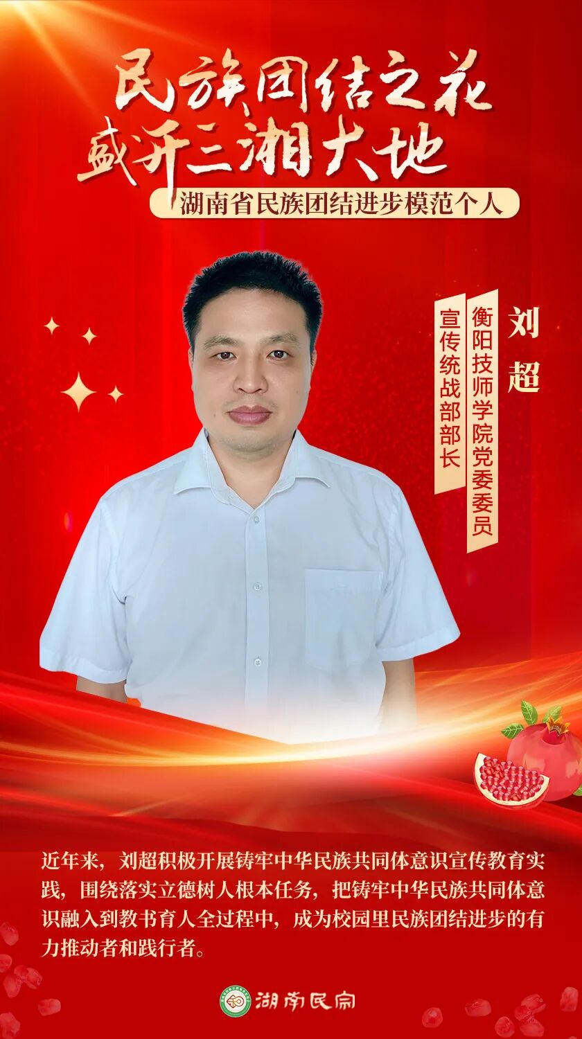刘超,衡阳技师学院党委委员、宣传统战部部长。他有形有感有效地将铸牢中华民族共同体意识融入教书育人全过程,成为校园里民族团结进步的推动者和践行者,先后获湖南省职业教育培训“优秀教师”等20余项荣誉,2023年该学院获评“湖南省民族团结进步示范学校”。2025年9月,中共湖南省委、湖南省人民政府授予刘超“湖南省民族团结进步模范个人”。