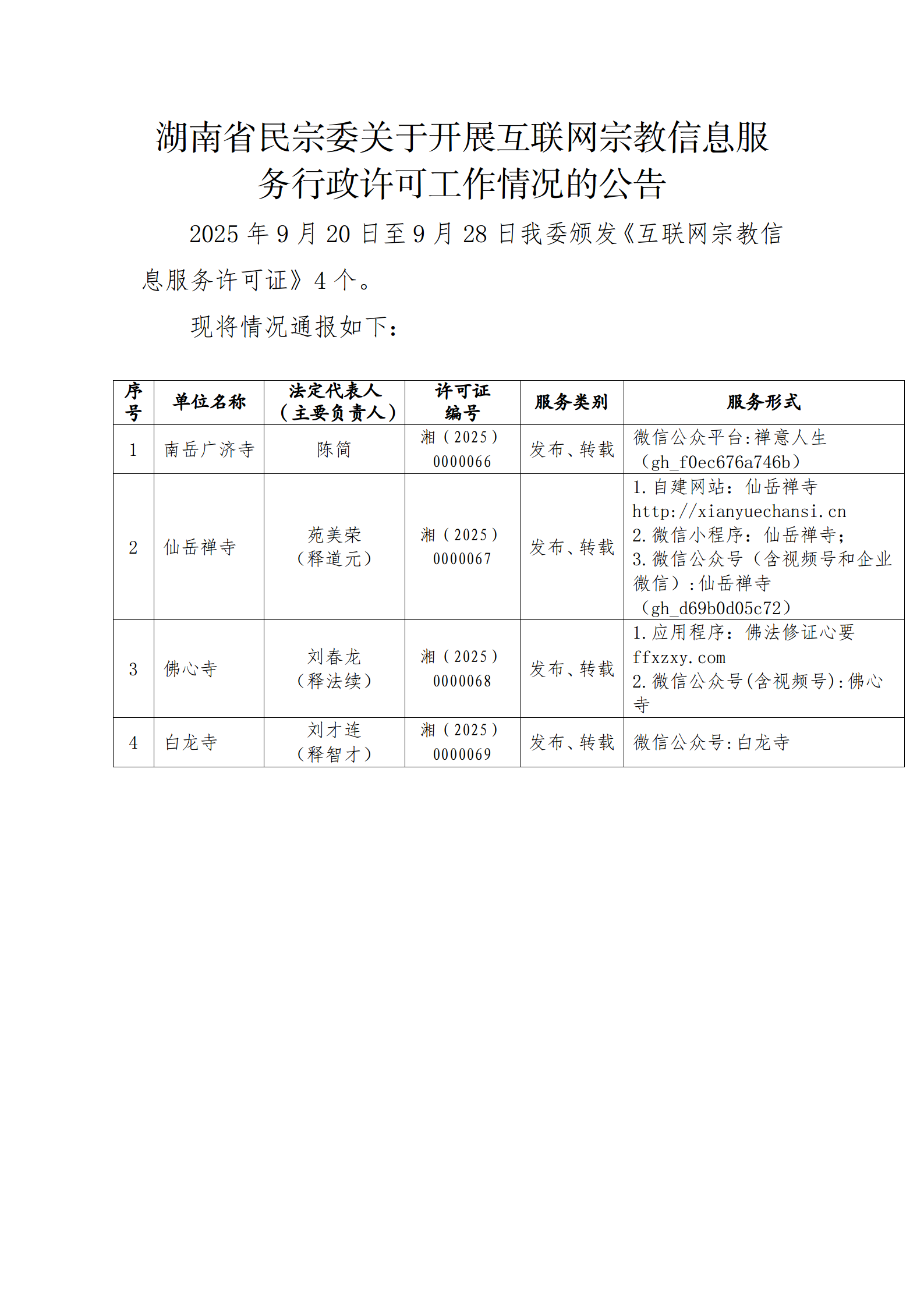 湖南省民宗委关于开展互联网宗教信息服务行政许可工作情况的公告(2025年9月20日至9月28日)