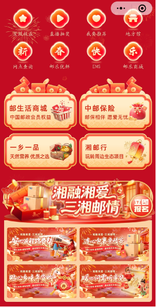 "贴心乡味年货购"服务在"邮乐"平台开设"湘味年货节"专区,提供邮政专项补贴,让农民工优惠选购名优年货。邵阳地区务工人员前往邮政指定网点,还有机会领取内含多档满减券的新春福袋,并享受"农民工年货包邮到家"服务。