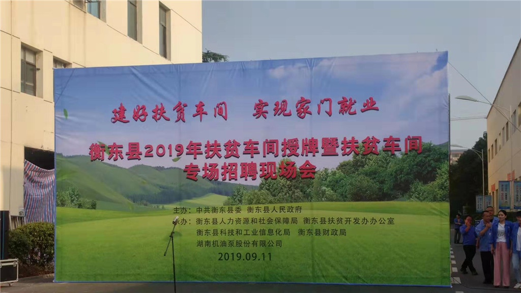2019年9月11日上午,衡东县2019年扶贫车间授牌暨扶贫车间专场招聘现场会,在衡东县机油泵股份有限公司举行。17家扶贫车间单位被授牌。