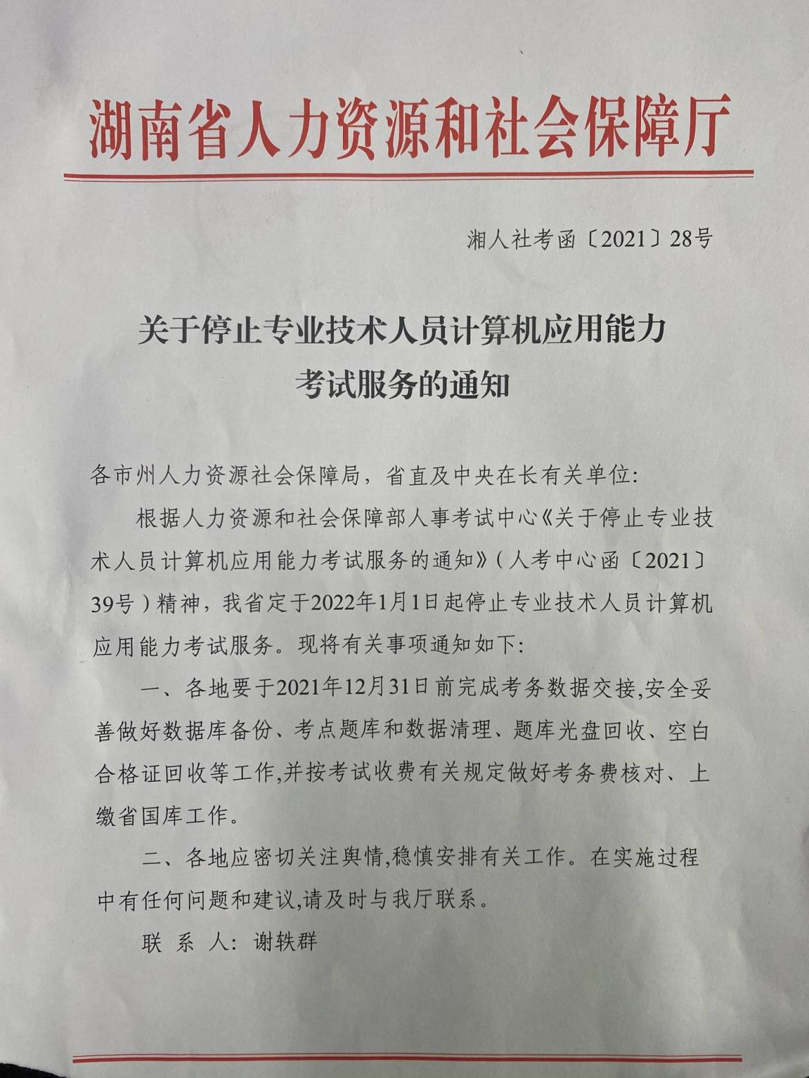 关于停止专业技术人员计算机应用能力考试服务的通知