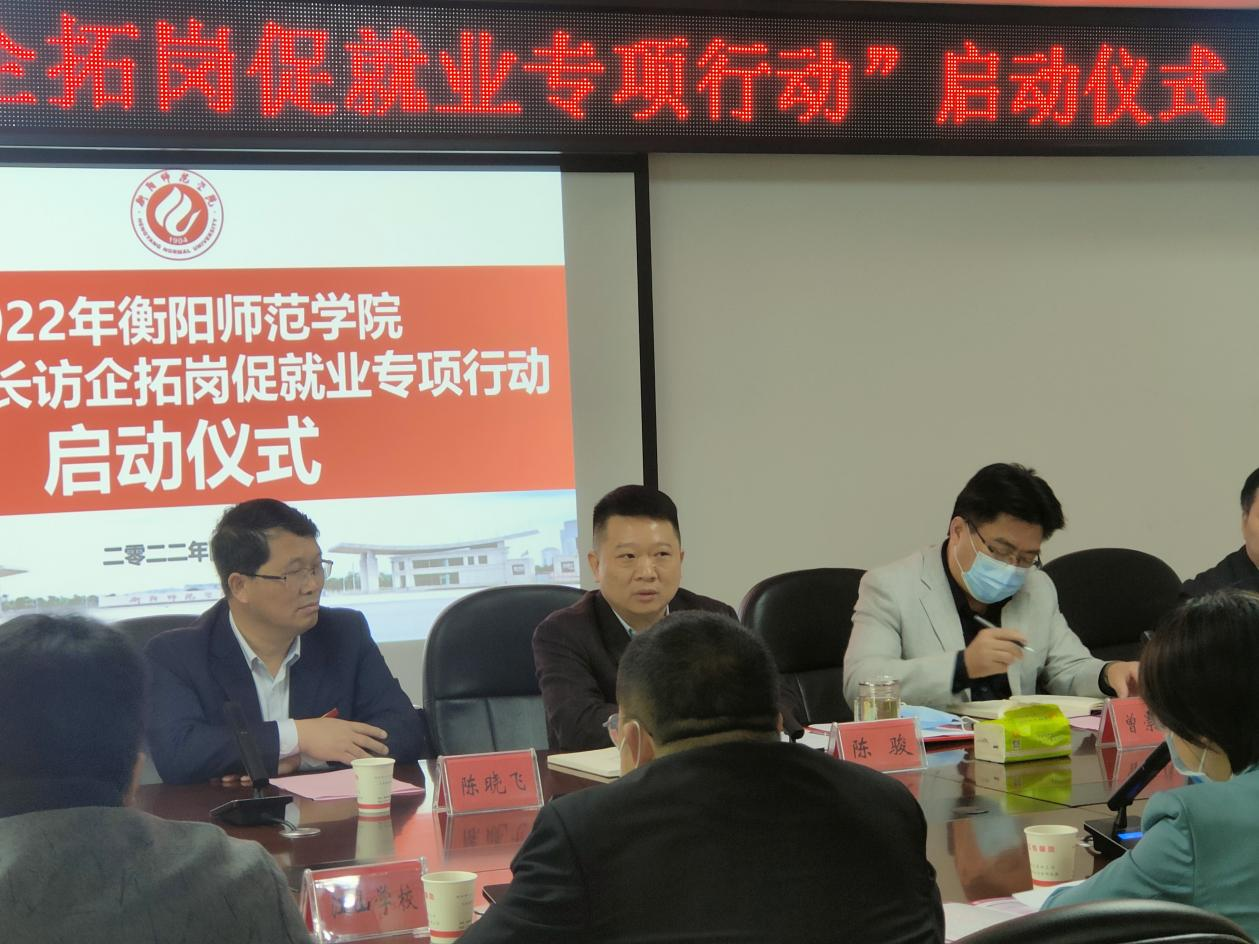 2022年4月19日,市人社局和衡阳师范学共同举办“衡阳师院书记校长访企拓岗促就业专项行动”启动仪式,进一步深化校政企三方合作,畅通人才供需渠道,全面促进2022届毕业生就业。市人社局局长陈骏、副局长曾崇伟,衡阳师范学院党委书记陈晓飞,恒光化工、泰豪通信车辆、瑞达电源等10家市重点企业代表参会。