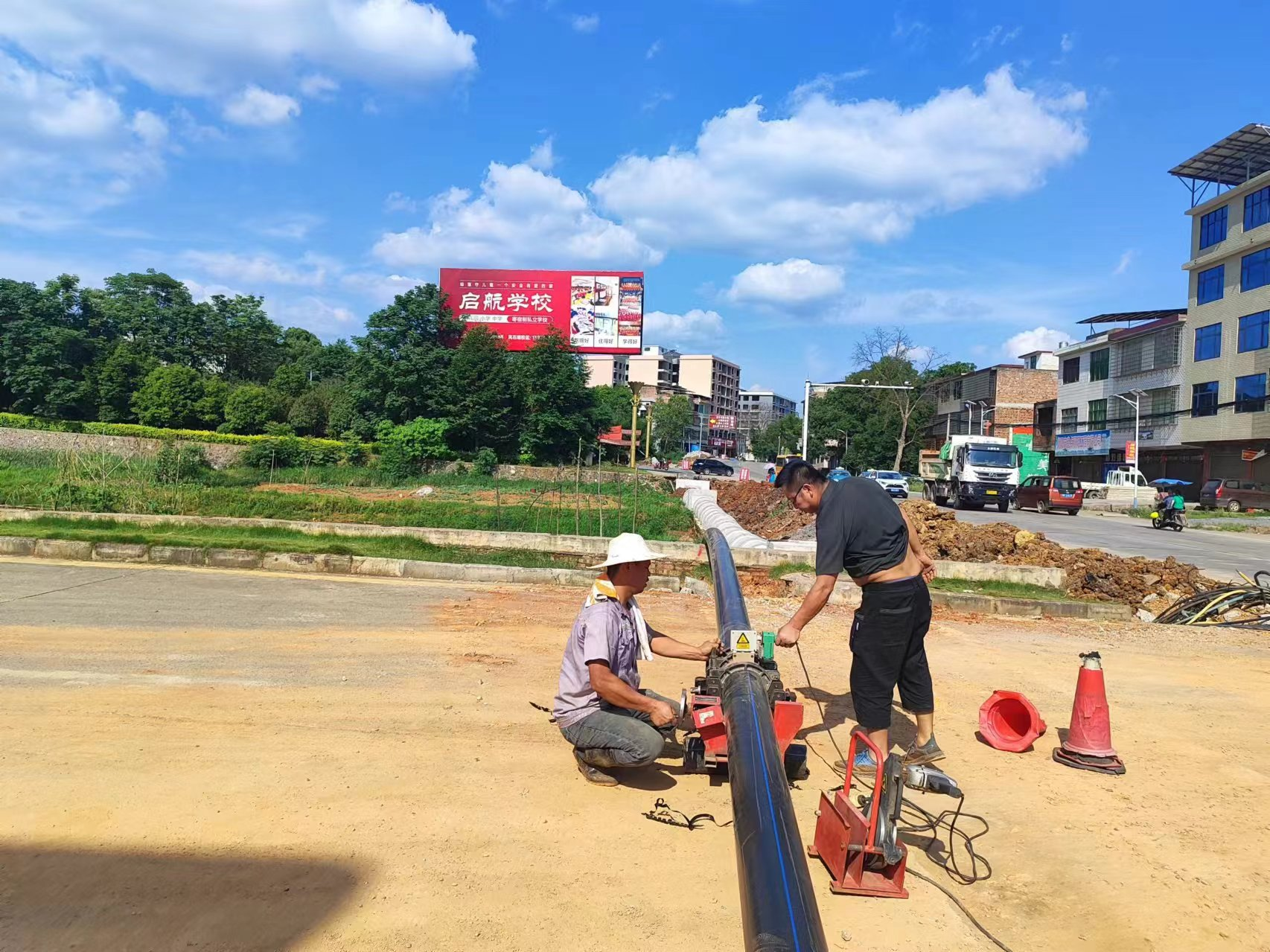 5月28日中午2:00,烈日炎炎,路面温度高达33℃,在祁东县永昌街道湖塘村、尚书村、风石堰镇紫冲村资源产业路项目现场,唐福冲水厂工作人员正挥汗如雨对途径紫冲村路段150余米PEDN200mm供水管道进行改移。