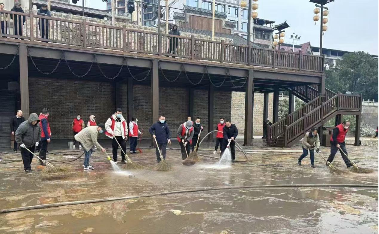 县水利局70余名干部职工化身志愿者并肩作战,对湘江亲水平台、景区步行道等重点区域集中攻坚,志愿者们弯腰捡拾纸屑杂物,扫把划过路面扬起细碎尘埃;水管高压喷射冲刷路面顽渍,扫帚紧随其后横扫积水与碎屑,一冲一扫间高效清理污物;有人手持抹布细细擦拭木围栏,将缝隙里的尘垢逐一擦净,让古色古香的围栏重焕温润光泽;手套磨得沾满泥污便随手更换,汗水顺着额角滑落浸湿衣衫,却没人停下脚步,只为让千年渡口洁净无垢。