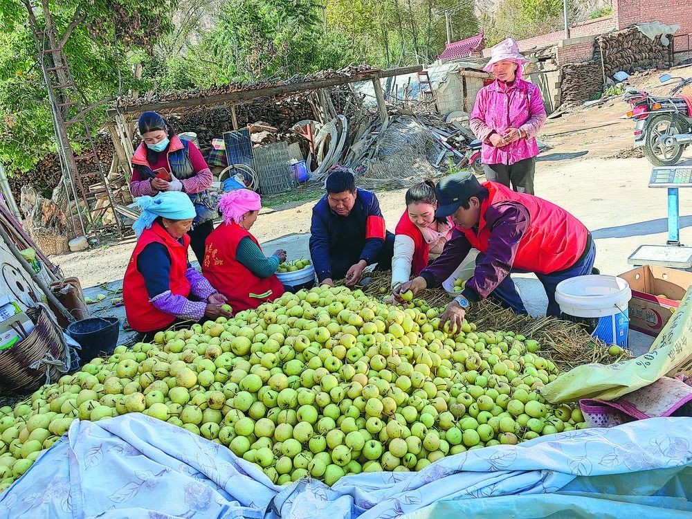青海贵德县河西镇多勒仓村、拉芨盖村党支部组织党员和志愿者帮助村民采摘、挑选、装箱“软儿梨”。图片来源:青海日报