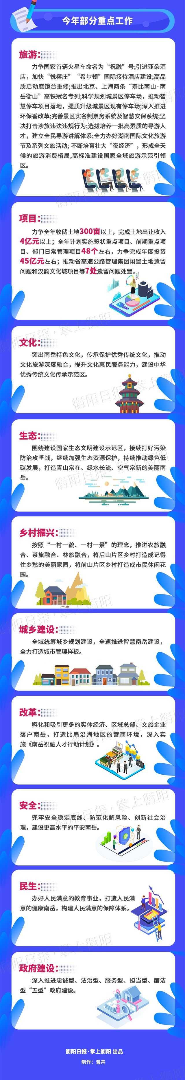 掌上衡阳客户端南岳频道3月23日讯(记者刘思远 通讯员文兰) 3月23日,南岳区第八届人民代表大会第六次会议开幕,南岳区人民政府区长蒋炳炎向大会作《政府工作报告》(以下简称《报告》),《报告》明确了今年舞好旅游龙头、坚持项目带动、彰显文化魅力、筑牢生态屏障、加快乡村振兴等十大重点工作。