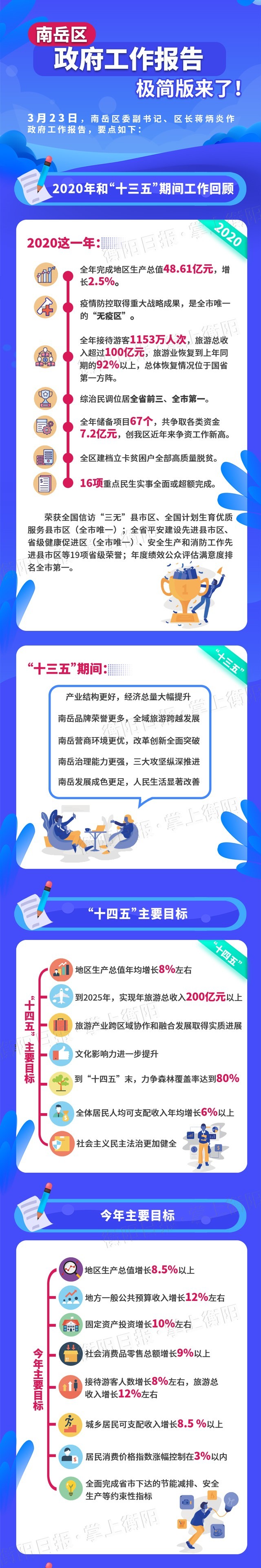 2020年,面对新冠肺炎疫情的严重冲击,南岳区逆风前行,全力开展疫情防控,奋力推进项目建设,聚力抓好争资争项,致力创新旅游营销,努力保障改善民生,强力兜牢安全底线,全年完成地区生产总值48.61亿元,增长2.5%;完成地方一般公共预算收入5.16亿元,社会消费品零售总额37.75亿元;完成门票收入3.07亿元,税收收入1.52亿元;固定资产投资增长9.8%;城镇居民人均可支配收入达4.56万元,增长5.8%,农村居民人均可支配收入达2.42万元,增长7.1%;金融机构存款、贷款余额为71.67亿元、46.4亿元,分别增长8.95%、22.87%;全年接待游客1153万人次,旅游总收入超过100亿元,旅游业恢复到上年同期的92%以上。