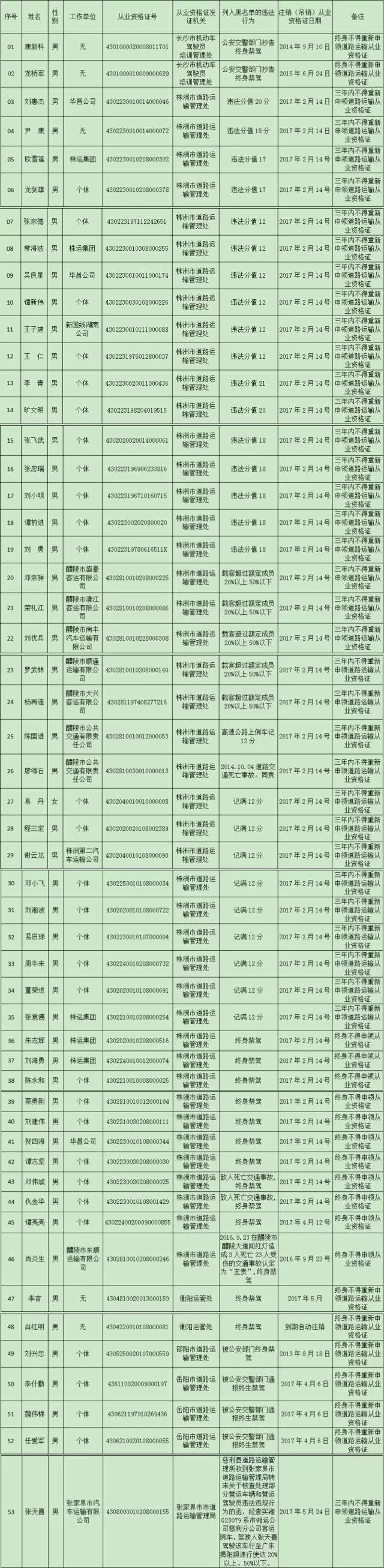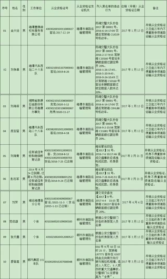 为切实加强全省道路运输安全生产监督管理,有效对道路运输生产经营者安全生产违法失信行为实施惩戒,根据《湖南省交通运输厅印发<关于贯彻落实湘政办明电[2016]102号文件加强道路运输安全管理的若干规定>的通知》(湘交安监[2016]127号)的有关条款规定,近日,湖南省交通运输厅公布了自开展“隐患清零”行动以来,被列入湖南省道路运输安全生产“黑名单”的营运驾驶员名单。今年4月至5月,共有63名驾驶员被列入“黑名单”。