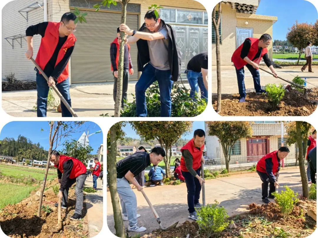 活动现场,民政干部职工身着“衡阳群众”红马甲,在香花村道路沿线栽树植绿。