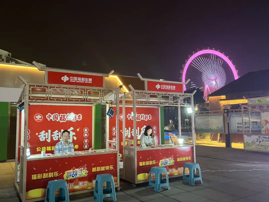 在潇湘八景广场,超大显示屏实时转播,衡阳队球迷来到场外直播点观赛,为球队加油鼓劲。福彩展位摆放着琳琅满目的福彩刮刮乐彩票,刮刮乐“即买即开即兑”的惊喜玩法,吸引众多球迷驻足挑选,纷纷购买彩票支持公益事业。