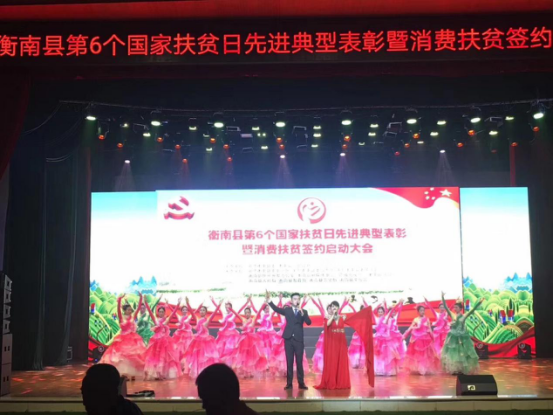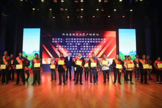 衡南县脱贫示范户胸佩红花、肩挎绶带上台接受表彰并与衡南县委书记胡果雄合影 颁奖现场,