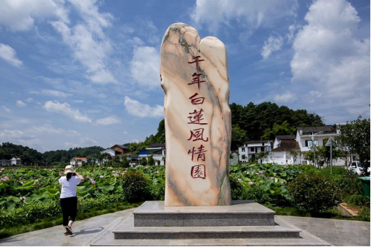 盛夏时节,走进白莲村的3A级“千年白莲风情园”,顿时令人心旷神怡,神清气爽。荷花在微风吹拂中翩然起舞,荷叶卷起阵阵“荷浪”,几只白色的大鸟在宽阔的荷塘间悠然徜徉。