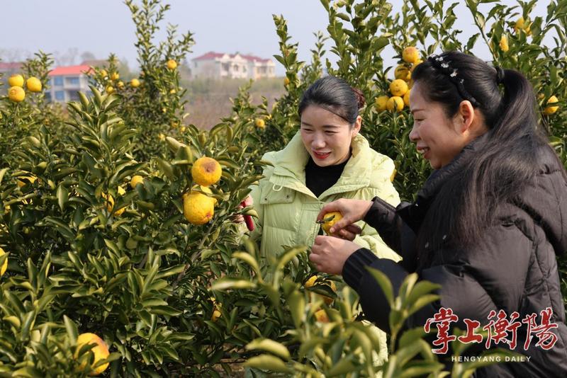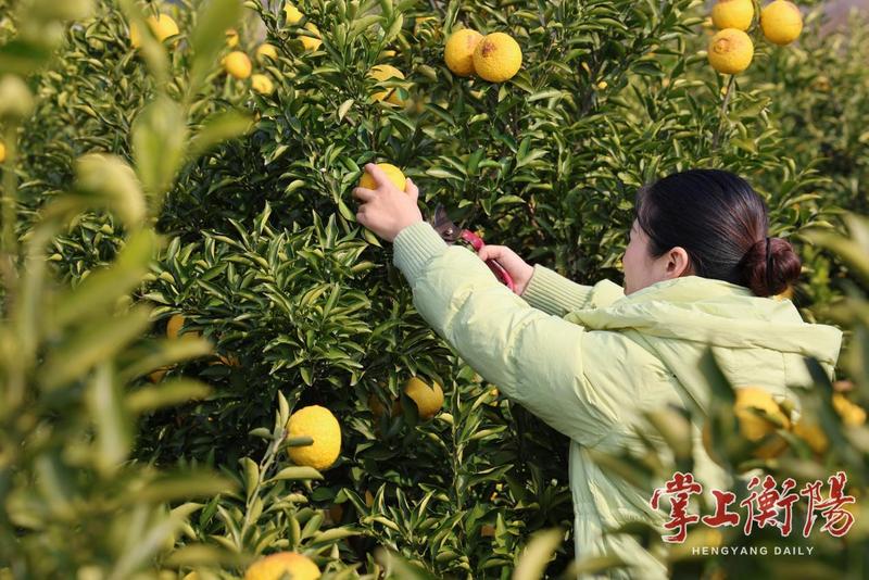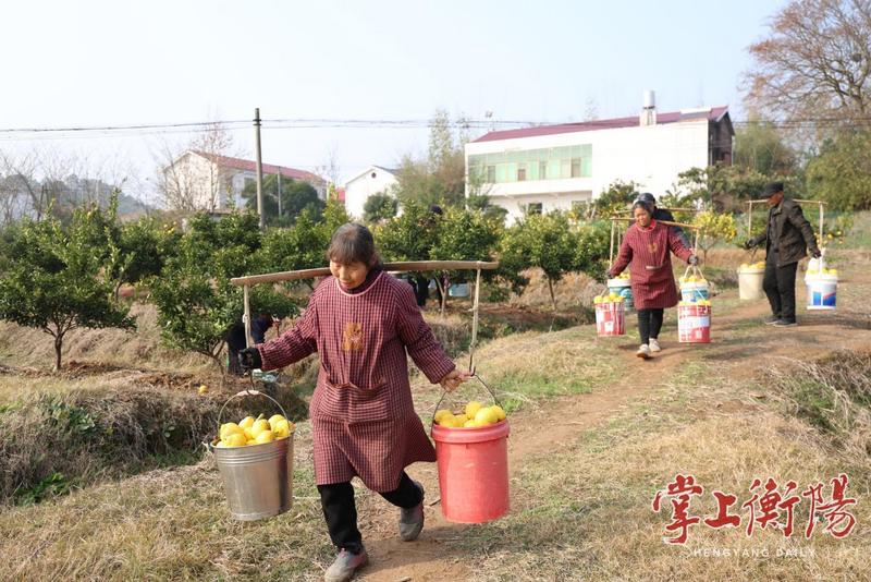 眼下,正值黄金贡柚陆续成熟时节,衡山县永和乡黄周村的黄金贡柚迎来采摘季,打开了一幅“柚”香满园的乡村振兴新画卷。 ▲果农挑着一担担的黄金贡柚,脸上洋溢着丰收的喜悦。周彭斌 摄 走进黄金贡柚种植基地里,一个个金灿灿的柚子挂满枝头,飘散着阵阵柚香,格外诱人。果农手持剪刀、提着桶子穿梭在林中,忙着采摘、分拣、打包。几名慕名而来的游客也加入了采摘队伍当中,果香和欢笑声汇成了一首喜庆欢快的丰收曲。 ▲游客在黄金贡柚基地现场体验采摘的乐趣。周彭斌 摄 “我们是通过去年的旅发大会知道永和这边有很多水果基地,所以就关注了它的开园时间。今天和朋友一起过来体验一下采摘的乐趣。这里的黄金贡柚个头又大、水分又足,非常地甜。”游客文素姣开心地说道。 据介绍,黄金贡柚是橘与柚杂交的新品种,色泽金黄、外观独特、果汁饱满。因口感细腻、化渣无核,好吃不上火,老少皆宜,目前被公认为“水果之王”。黄金贡柚在12月左右成熟,采摘后在常温下可贮存6至10个月,贮存一个月后风味更佳。 ▲游客在果园里采摘黄金贡柚。周彭斌 摄 该基地采用科学的种植技术和管理模式,注重品质和口感,产出的黄金贡柚深受消费者的喜爱。今年是黄金贡柚挂果的第五年,预计产量能达到6万斤。 “黄金贡柚的特色是脆、化渣,口感比较好。因为施用的大部分都是有机肥,所以品质上乘。而且今年黄金贡柚的个头普遍比较大,大部分果子能达到70—80mm。”衡山尚品优果蔬种植基地技术负责人胡高利表示。 ▲黄周村20多名村民实现家门口就业增收。周彭斌 摄 2018年,基地负责人钱润枝发现了黄金贡柚的种植前景,在黄周村流转了140余亩土地种植黄金贡柚。同时,基地还以“公司+基地+农户”的形式,吸纳了周边20多名村民在基地务工,让他们实现家门口就业增收。 衡山县永和乡素有“小水果之乡”的美誉,凭借地势平坦、土壤肥沃、阳光充足的自然条件,发展出以菁香桃、冬枣、沃柑、葡萄、砂糖橘等为主的水果产业,形成“四季有果、全域有景”的特色格局。 ▲一个个金灿灿的黄金贡柚挂满枝头。周彭斌 摄 目前,永和乡水果种植面积1.2万余亩,年产值突破3.5亿元,从业人员超3000人,其中百亩以上基地10余个,涵盖“五大品类”和“十大示范基地”,并通过“政府引导、企业主导”模式推动规模化发展。